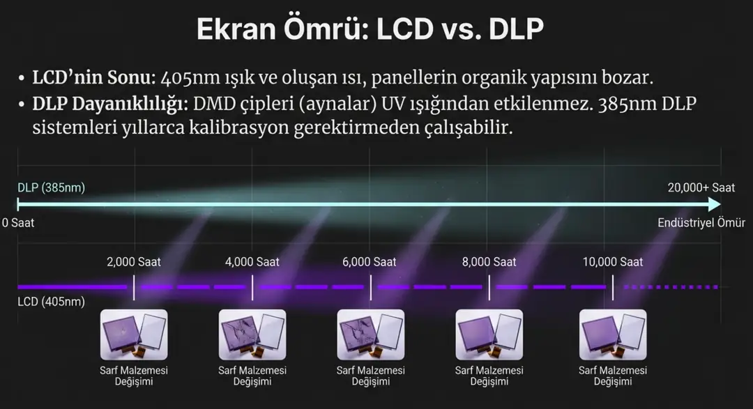 Uzun vadede toplam sahip olma maliyeti (TCO) açısından 385nm DLP sistemler, yüksek ilk yatırımına rağmen daha avantajlıdır.