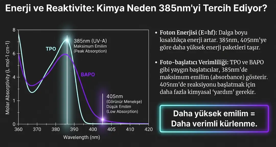 Bu nedenle 385nm, 405nm’ye kıyasla daha yüksek enerjili bir ışık kaynağıdır.