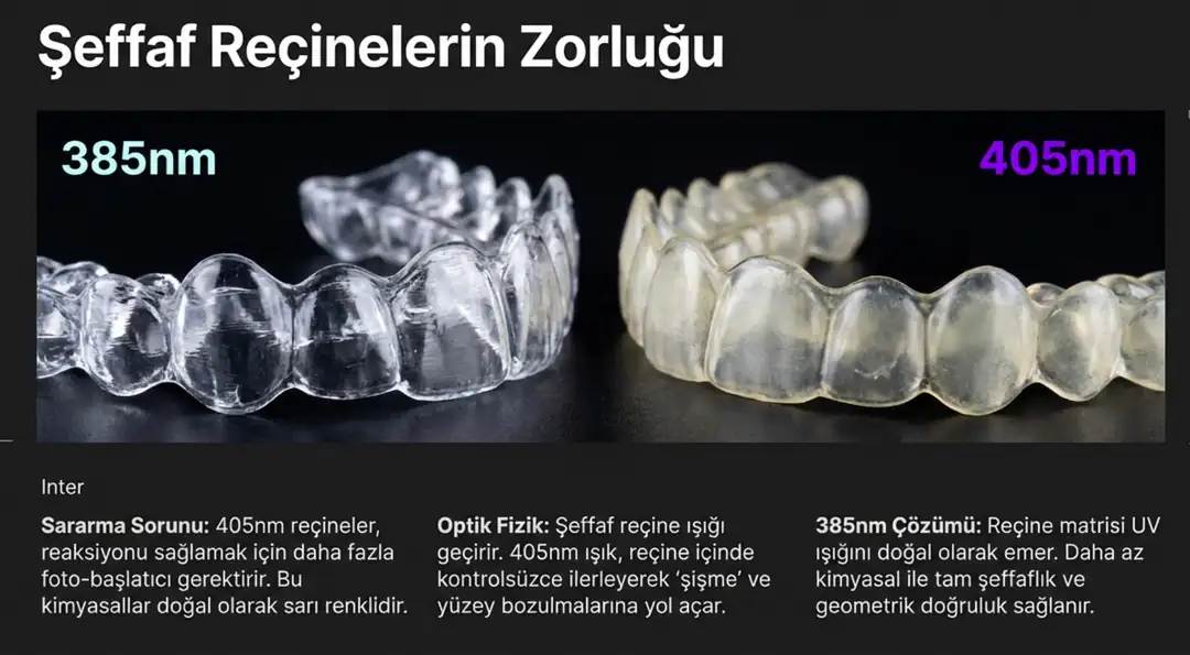 Aligner modelleri ve cerrahi kılavuzlar gibi şeffaf reçineler, dalga boyu seçimine karşı son derece hassastır.