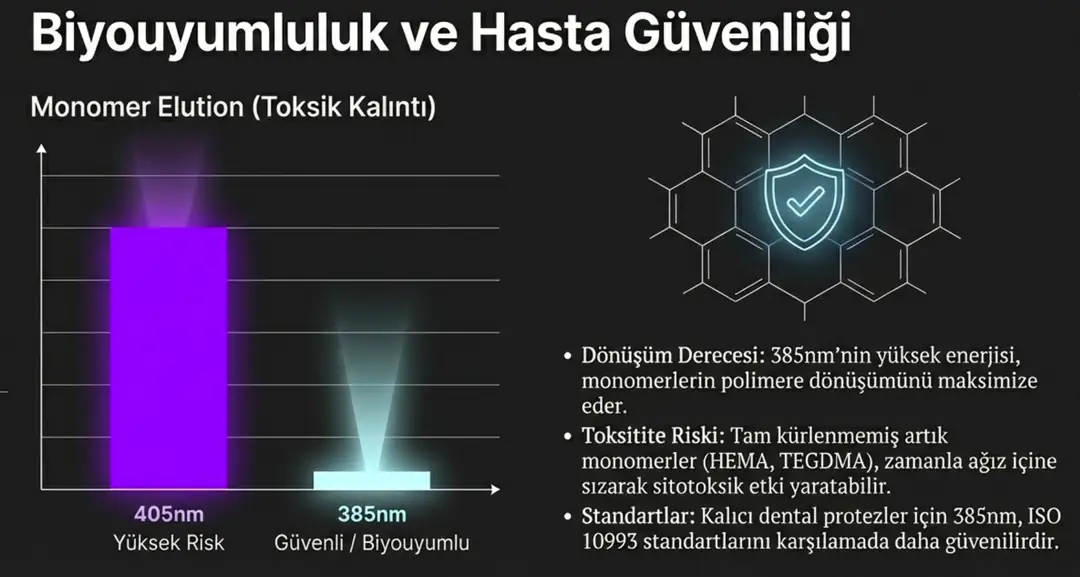 Ağız içi kullanılan parçalar için asıl risk, artık monomer salınımıdır (HEMA, UDMA vb.).